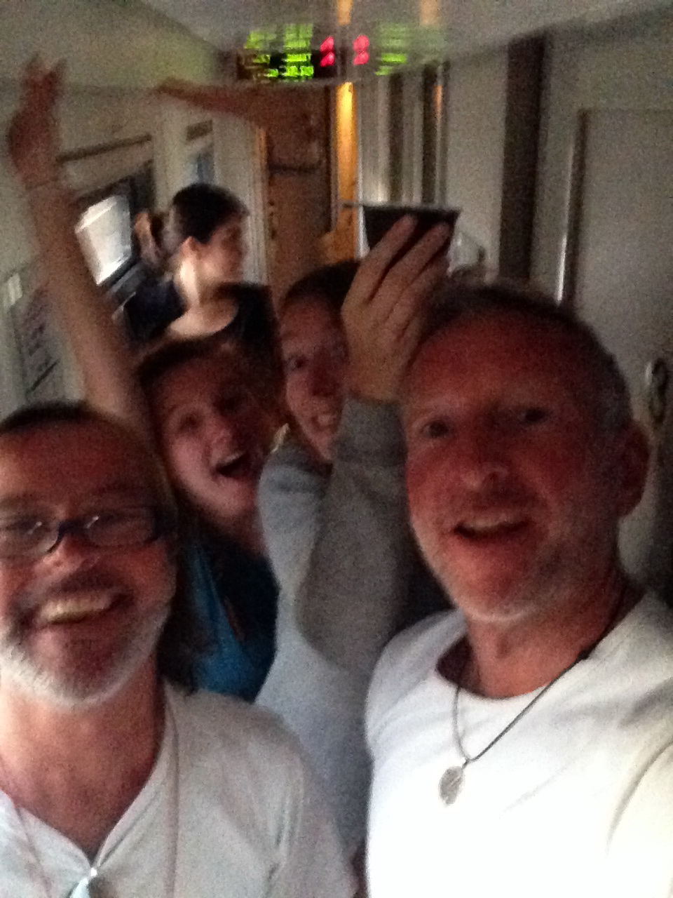 Mein Waggon Nr. 9 des Zuges 362 von Irkutsk nach Ulan Bataar ist ausschließlich für Touristen, keine Einheimischen sind an Bord. Das war im letzten Zug anders. Dieses Mal habe ich das Bett unten, mit mir im Abteil reisen Greg aus Sydney und zwei Mädels einer 9-Frauen-und-1-Mann-Gruppe aus unterschiedlichen europäischen Ländern. Lisa und Anniek heißen die beiden und kommen, wie soll’s auch anders sein, aus den Niederlanden. Irgendwie hab ich’s mit unseren Nachbarn, auf den Zugfahrten verfolgen die mich. Die anderen Mädels kommen u.a. aus Dänemark, Norwegen, China und Australien, den männlichen Teilnehmer habe ich bei dem ganzen Weibsvolk nicht so recht wahrgenommen.