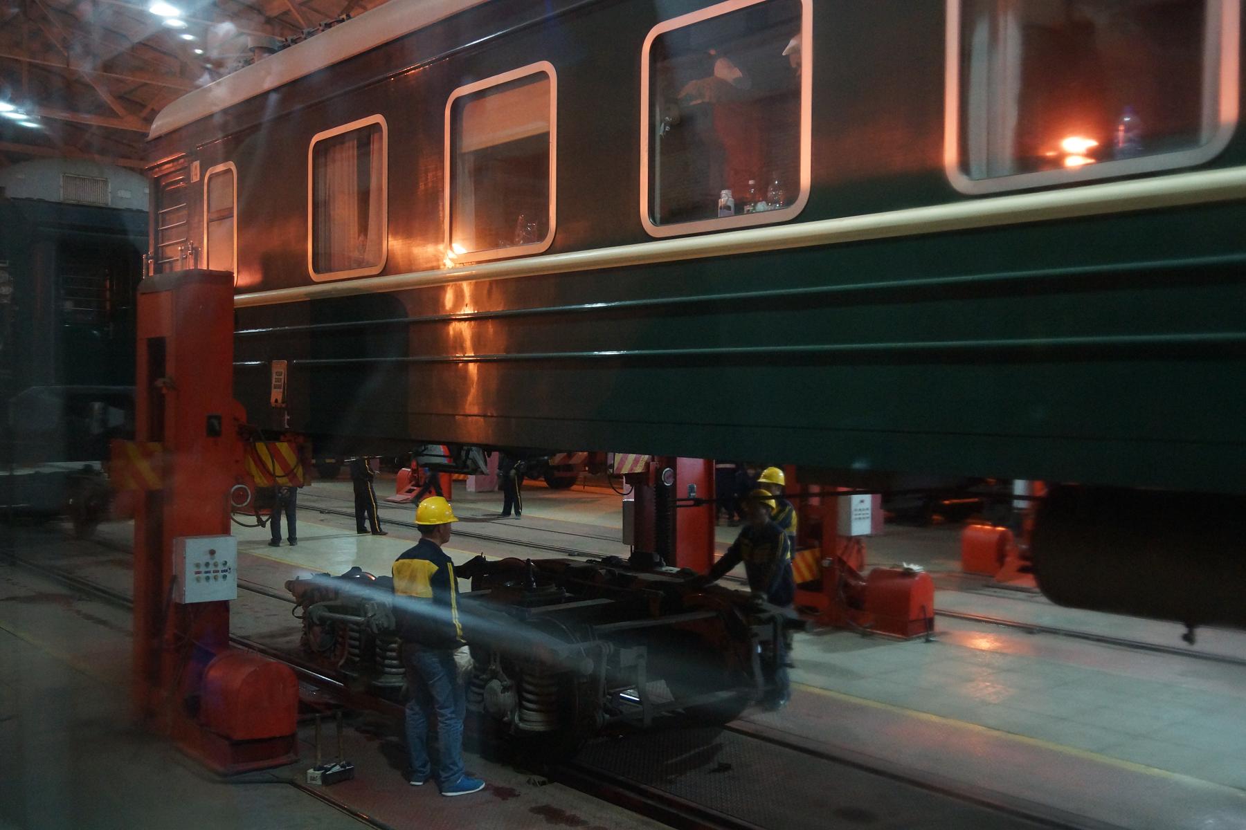 Nun, dann sind wir schnell durch, dachte ich, doch weit gefehlt. Uns stand nämlich die allseits mit Spannung erwartete Umrüstung des Zuges auf die schmalere Spurbreite des chinesischen Schienensystems bevor. Diese ist nämlich weltweit einmalig, tatsächlich ein Spektakel und ein technisches Wunderwerk. Die Waggons werden einzeln entkoppelt, zusammen in eine Art Stellwerk gefahren und mit einer, so meine Vermutung, hydraulischen Hebeeinrichtungen, 4 Stück je Waggon – vorne, hinten, links, rechts, ca. 3 Meter in die Luft gehoben, während unter dem Rock das Höschen, äh, die Achsen gewechselt werden – das alles bei voller Beladung und mit allen Reisenden an Bord! Die Achsen werden auf eine Art Schienensystem heraus gefahren und die schmaleren Achsen herein gefahren. nachdem die Waggons auf die neuen Achsen gesetzt wurden, wird das Höschen wieder zugeschnürt, mensch, ich meine natürlich, die Achsen fixiert. Irgendwie habe ich heute obszöne Hintergedanken aber das sei nach den vielen Reisewochen ja mal erlaubt ;-).