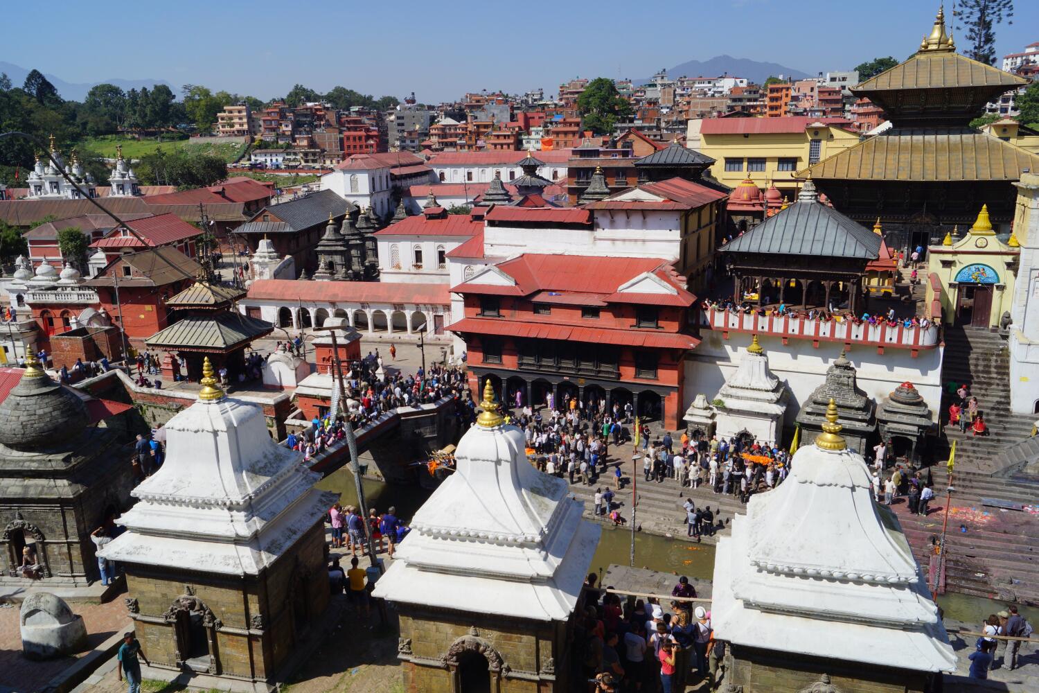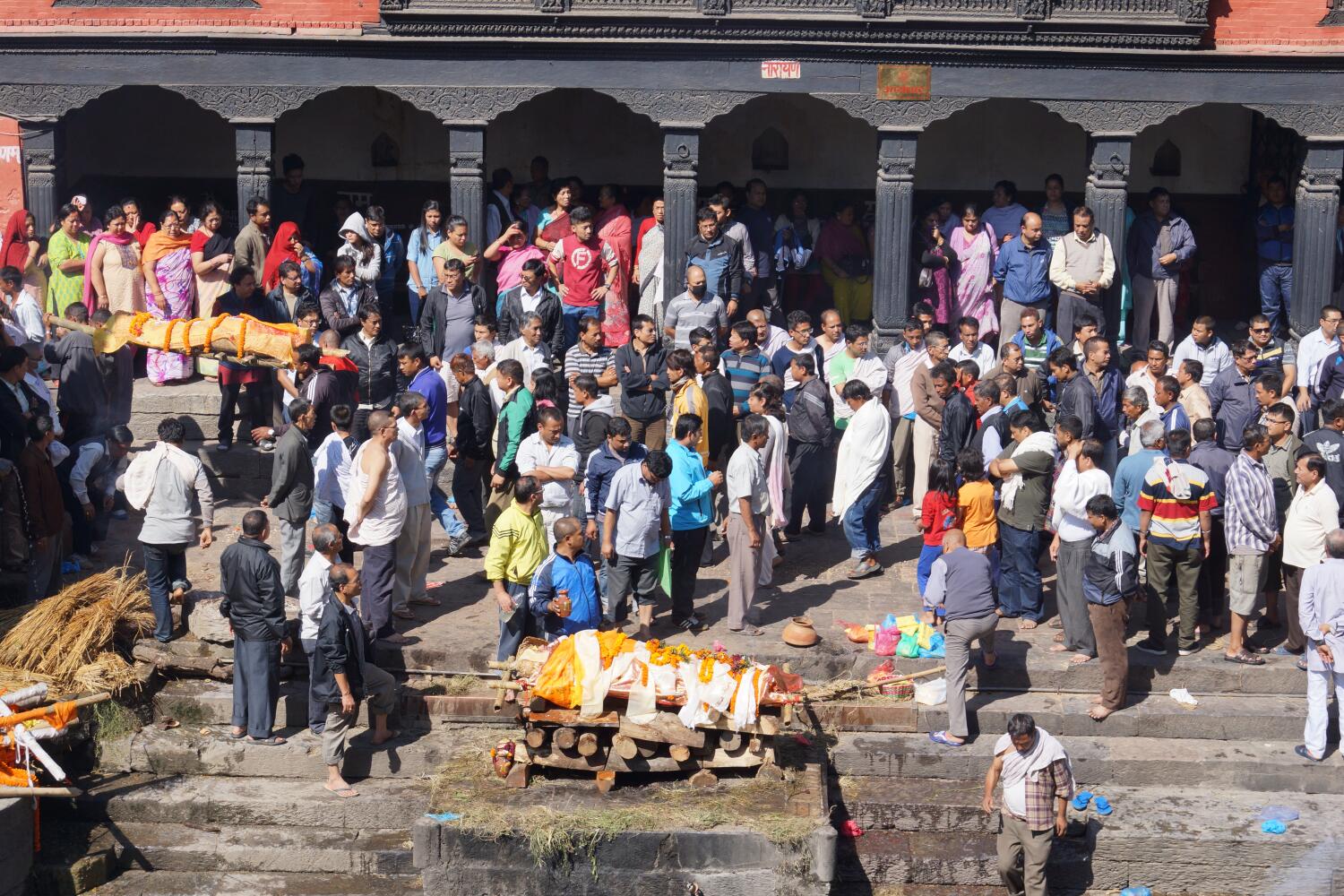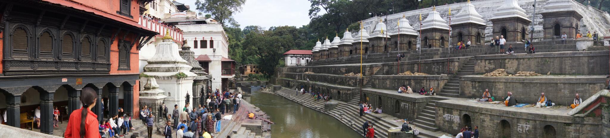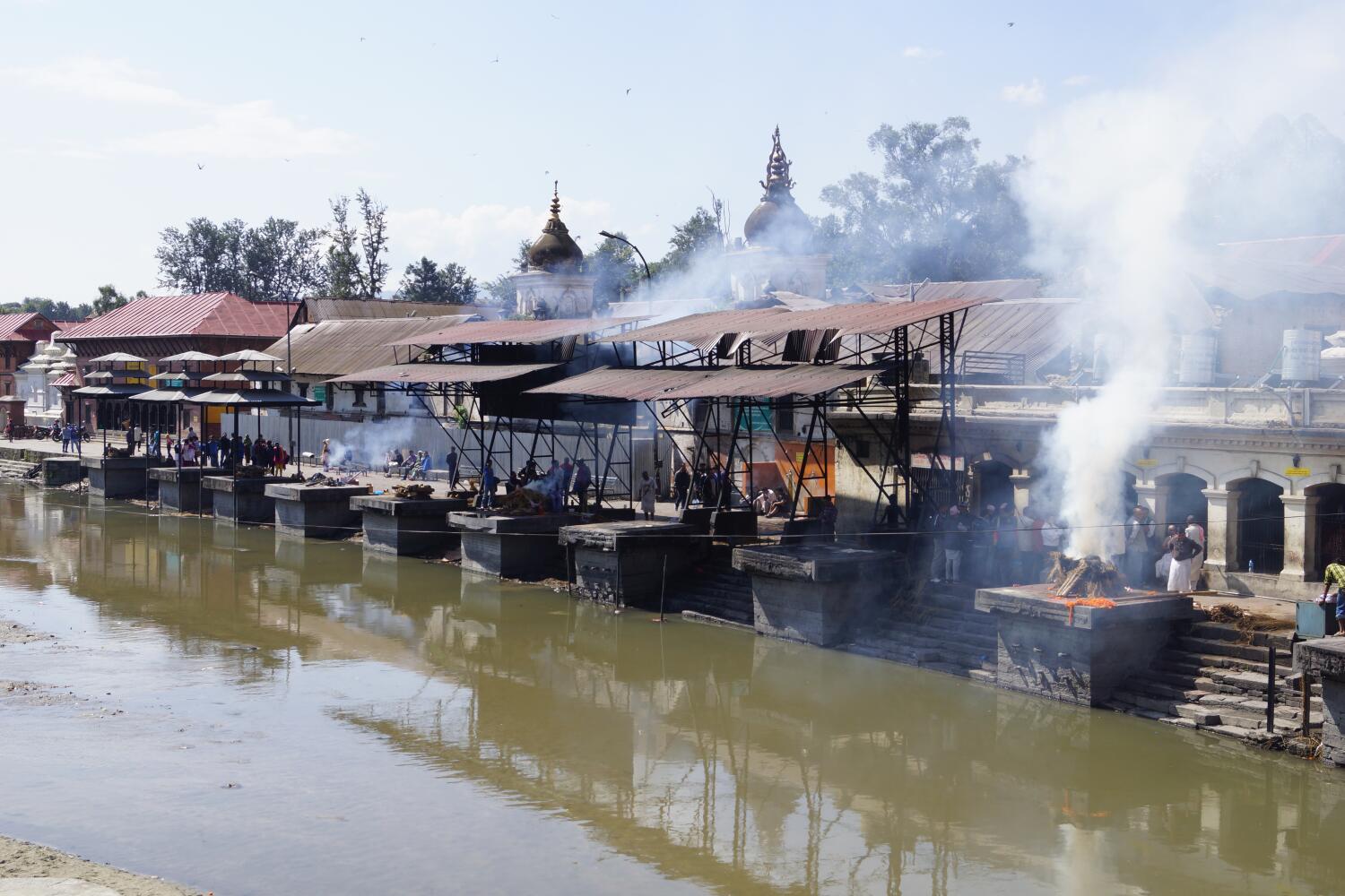 Leicht verstört hat uns nämlich der Besuch der Ghats (Ufer) am Bagmati-Fluß, an denen rund um die Uhr auf speziellen Plattformen auf einer Art Holz-Scheiterhaufen verstorbene Hindus nach ihrem Tode verbrannt werden – öffentlich versteht sich. Irgendwie ist die Stimmung gespenstisch und beklemmend, da sitzen wir gegenüber von den Feuerbestattungs-Ghats und schauen dem zeremoniellen Treiben der Hindus zu. Angehörige trauern und lassen ihrem Schmerz freien Lauf, während an der Bestattungszeremonie Beteiligten die Köpfe kahl rasiert werden, Freunde und Bekannte Blumen auf den Leichnam legen oder Wasser aus dem (heiligen) Fluß über den toten Körper träufeln. Überall stehen Zuschauer, Einheimische und Touristen, es wird fotografiert, gefilmt, geredet … touristische Führer erklären alles rund um die Zeremonie … es hat etwas Surreales. Es finden drei Feuerbestattungen gleichzeitig statt, zwei der leblosen Körper sind alt, bei einem scheint es sich um einen jüngeren Leichnam zu handeln. Bevor die Toten angezündet werden machen wir uns vom Acker, den süßlichen Geruch verbrennender Körper brauchen wir nun wirklich nicht.