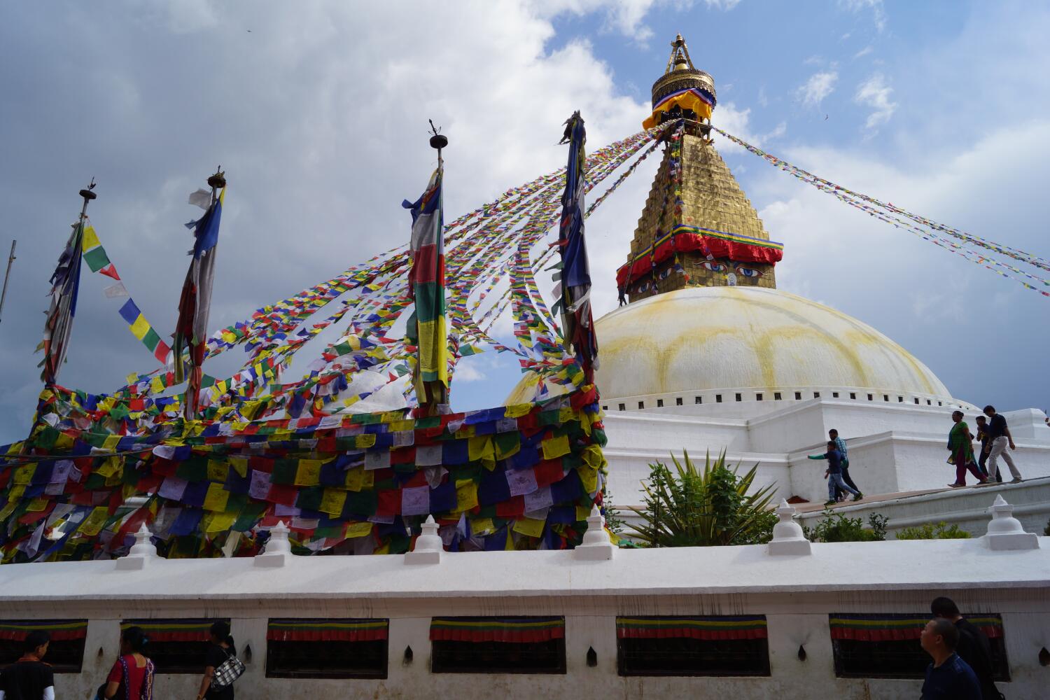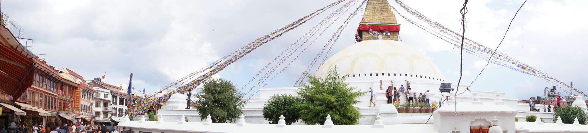 Die Stupa von Bodnath ist neben Swayambhunath das wichtigste buddhistische Heiligtum Nepals. Mit einem Durchmesser von 40 Metern ist sie zudem eines der größten buddhistischen Bauwerke der Welt. Wie bei vielen anderen Stupas, vor allem in Tibet, ist der Grundriß auch hier einem tibetanischen Mandala nachempfunden. Die Hintergründe und Daten ihrer Entstehung sind umstritten, möglicherweise stammt sie aber aus dem 7. Jahrhundert. Wie so oft in Nepal vermischen sich auch hier Fakten und Legenden zu einem unauflösbaren Mysterium. Verbürgt ist jedoch, daß an dem Gelände der Stupa schon vor Jahrhunderten ein Handelsweg nach Tibet vorbeiführte. Wahrscheinlich nutzten die Reisenden die Stupa zu einem letzten inbrünstigen Gebet, daß sie gegen die Gefahren der langen Reise absichern sollte. Sinn macht das auf jeden Fall, wenn man auf den Himalaya hoch will, ich hätte das Ding noch größer gebaut und gar kräftig gebetet.