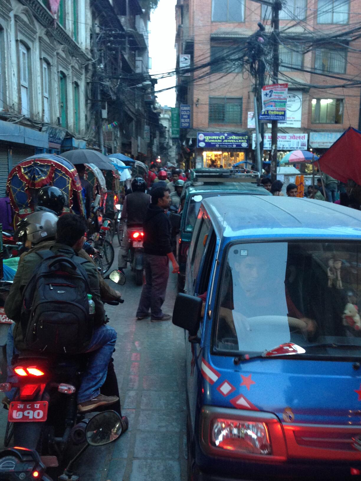 Von Bodnath ging es dann am frühen Nachmittag nach Bhaktapur, der ehemaligen Königsstadt. Interessant war die Fahrt mit dem Taxi dorthin. Offensichtlich hatten wir einen sehr heimatverbundenen Fahrer, es schien zumindest so, als sei er noch nicht allzu oft aus Kathmandu raus gekommen. Er hatte sichtlich Schwierigkeiten, den richtigen Weg fernab der Heimat in das 15 Kilometer entfernte Bhaktapur zu finden. Ich machte mir einen Spaß daraus und verfolgte seine Fahrt auf meinem iPad. Da ich mit Offline-Karten aller Länder, die ich bereise, ausgestattet war und es zudem überall auf der Welt ein GPS-Signal gibt, war ich quasi ein wandelndes, äh, in diesem Fall fahrendes Navi. Ich hätte dem guten Mann also genau sagen können, wo er hin muß. Letztlich hat aber meine gute Seele gewonnen und ich habe ihm die Blamage erspart. Für uns hat es so zwar länger gedauert, nach Bhaktapur zu kommen, schließlich mußte er sich mehrfach durchfragen, dafür hatten wir aber unerwarteten Spaß. Was will man mehr?